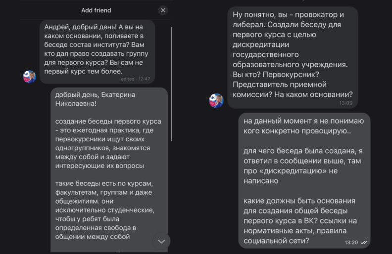 Утром 11 августа она вступила по ссылке в закрытый чат студентов. Молодой человек удалил ее оттуда, предварительно объяснив, что это беседа исключительно для учащихся. Далее все перешло в личные сообщения, где Левдина назвала Андрея «провокатором», который дискредитирует институт. Коньков признается, что никогда не преследовал таких целей.
