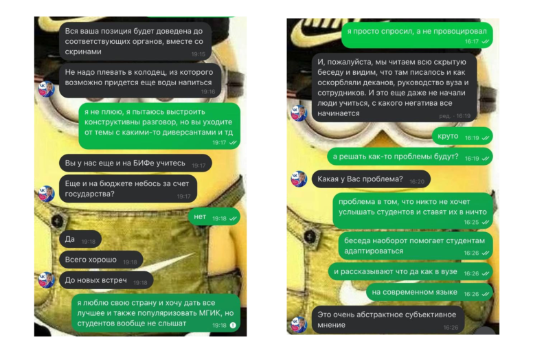 Один из учащихся написал Левдиной в личные сообщения и попросил объяснить причину удаления его комментариев. В переписке, которая есть в распоряжении редакции, Екатерина стала угрожать студенту полицией, а также предупредила: все студенческие чаты читаются руководством. Также она заявила, что у администрации есть информатор, который «сливает ей сообщения» из другой беседы — чата общежития МГИКа «Корпус Б» (у МГИКа есть три общежития А, Б и В — прим. «Черта»). В нем, как считает Левдина, студенты насмехались над трагедией на Крымском мосту.