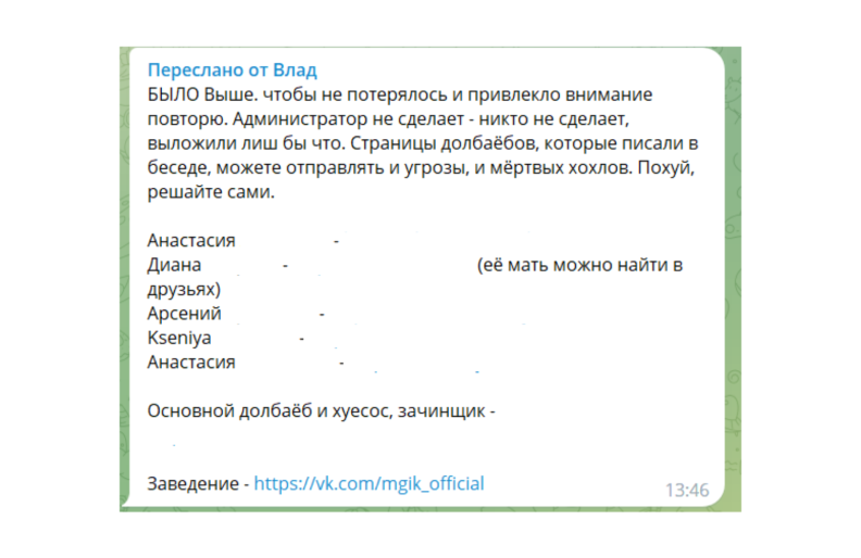 Один из студентов МГИКа Дмитрий (имя изменено) рассказал «Черте», что его и его родственников стали обзывать «свиньями», «либеральной петушней» и напрямую угрожать расправой. Скриншоты оскорблений есть в распоряжении редакции. По словам Дмитрия, на данный момент, он и другие студенты очень испуганы и удалили свои личные страницы.