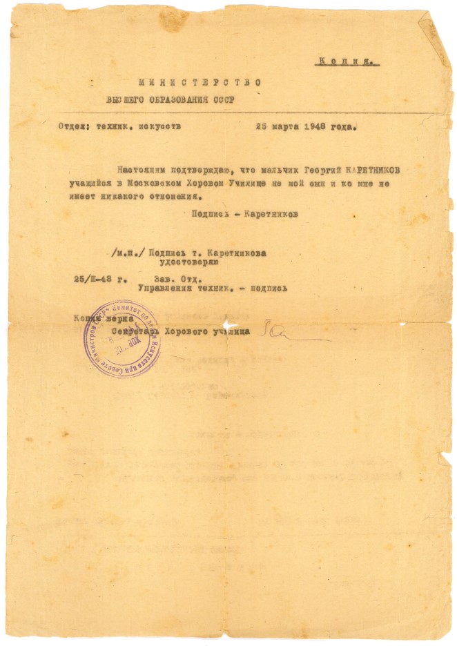 «Настоящим подтверждаю, что мальчик Георгий Каретников, учащийся в Московском Хоровом Училище не мой сын и ко мне не имеет никакого отношения. Подпись — Каретников».