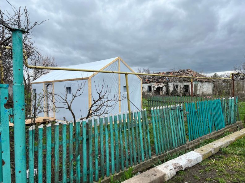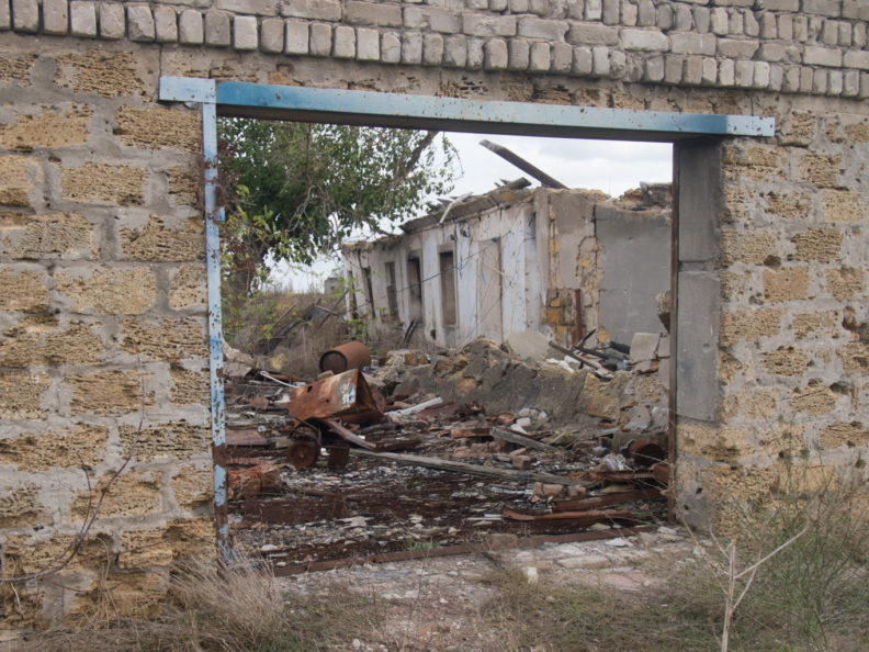 Поречье, красивое село, раскинулось на холме над рекой. Архитектура необычная: хаты, сараи и невысокие ограды огородов сложены из ракушечника и похожи на античные руины. Хатки мазаные, нежно-голубые, мел с синькой. Все железные ворота и профнастил заборов как решето — прилетало тут нормально. Кое-где на крышах возятся мужики. Некоторые крыши затянуты синей строительной пленкой — значит, хозяева еще не вернулись. Тетки говорят, что пленкой пустые дома накрывали волонтеры-баптисты.