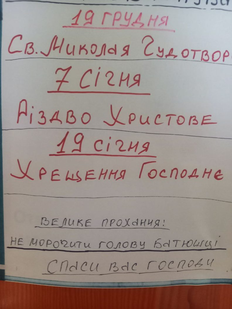 Мы все делаем по Писанию, чтобы не получилось вражды, уступаем. Это ж не политика, мы боремся за место в Царствии Небесном, за прощение своих грехов. Я им сказал сразу: «Храм я вам отдам без проблем». Будем так же, как в советское время, собираться в каком-то домике, спокойно молиться Богу. Так сейчас везде, где забрали храмы — священник с общиной уходит, а храм стоит в лучшем случае пустой, а чаще вообще закрытый. Тут есть один, в районе, вчера было Рождество, там даже службы не было. Когда храм отбирали, то наехала целая куча священников из ПЦУ, а почему сейчас их нет, я не знаю.